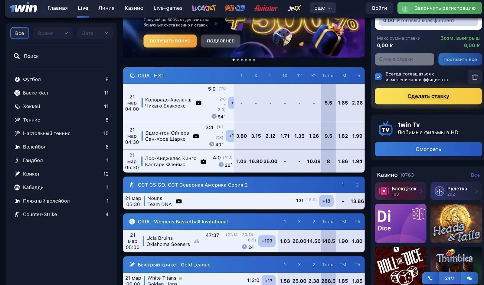 - Лайв или линия. Посетитель может начать делать ставки на спорт в прематче или посмотреть подборку лайв-событий. 1 вин обозревает более 20 спортивных дисциплин, поэтому каждый день предлагает несколько сотен ивентов.